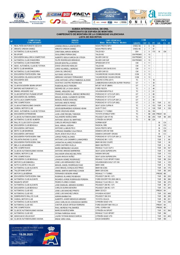 Con la lista definitiva de inscritos publicada, serán 62 pilotos los que tomarán la salida los días 26/27/28 de septiembre en la Subida Internacional de Onil, última prueba del Campeonato Nacional de Montaña AUTOhebdo Sport 2025.