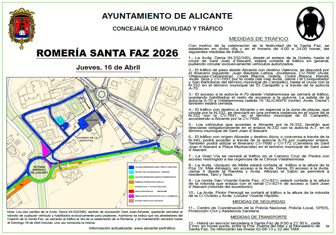 Con motivo de la celebración de la festividad de la Santa Faz, se establecen durante la jornada del jueves, entre las 4:00 y las 24:00 horas, se habilitarán los desvíos por el cierre al tráfico del itinerario de la peregrina por la avenida de Denia (N332-340), estableciéndose los cortes oportunos en las confluencias con Vázquez de Mella, Gran Vía y Vía Parque y procurando los desvíos oportunos por el frente litoral en dirección a las playas por la avenida de Villajoyosa (Cantera) y hacia la A70. Quedará cerrado el acceso 10 de la A70 de Vistahermosa, afectado por la peregrinación, al tiempo que se recomienda utilizar el resto de accesos de la autovía para entrar o salir a la ciudad.