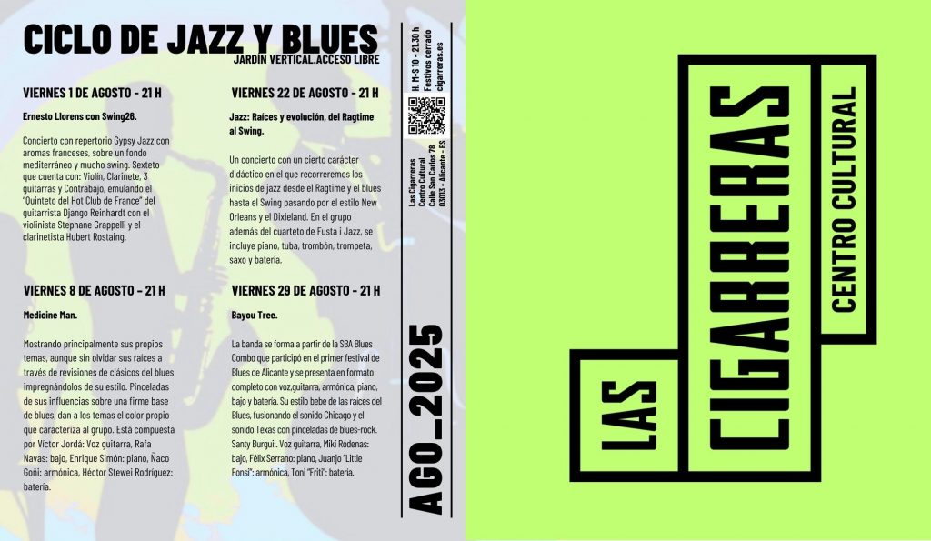 Alicante, 31 de julio de 2025. El Ayuntamiento de Alicante invita este mes de agosto a disfrutar de dos grandes propuestas culturales musicales con conciertos al aire libre gratuitos. La primera es una nueva edición del ciclo de blues y jazz que tiene lugar los viernes a las 21 horas en el Jardín Vertical de Las Cigarreras, y la otra es el exitoso programa ‘Verano de músicas’ en la Plaza municipal que continúa su programación entre las 19,30 y las 21 horas.