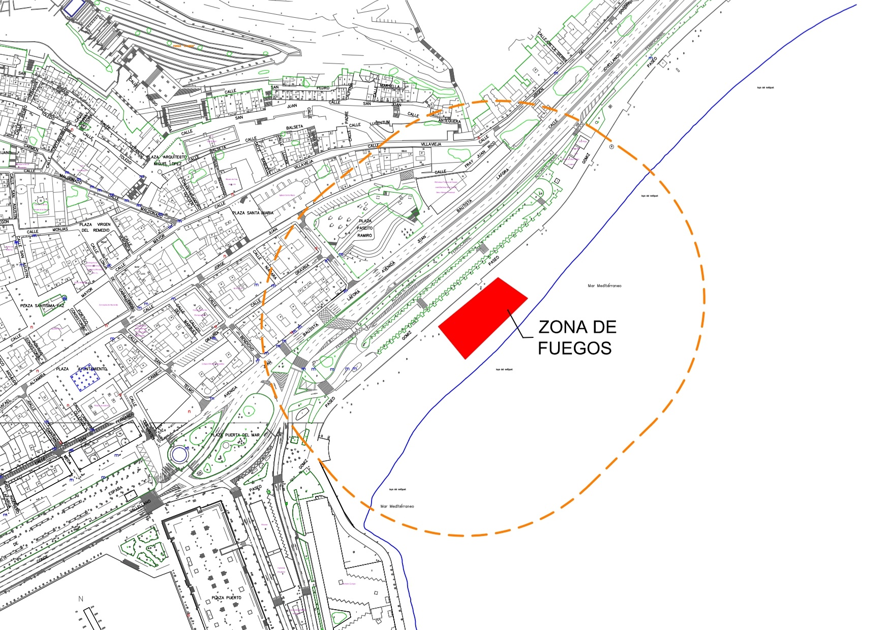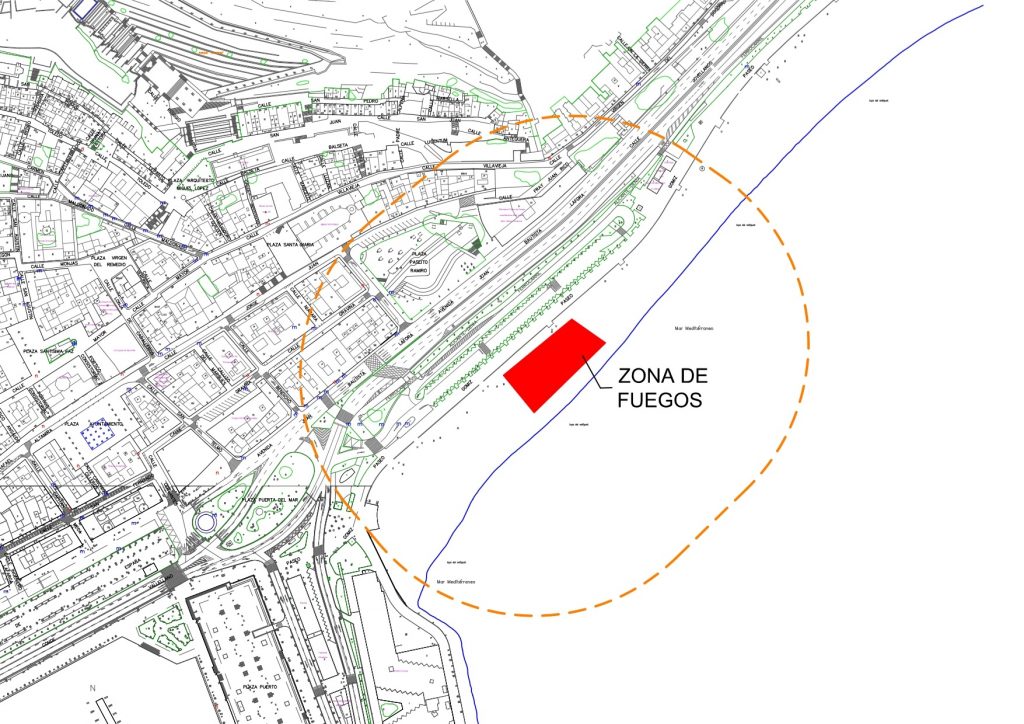 La zona de disparo estará situada en el propio arenal, a la altura del Paseíto de Ramiro y, según los cálculos estimados, se espera que sean unos 21.000 m² los que puedan ocupar los asistentes en la propia playa. A esta área se sumarán los espectadores que puedan presenciar los espectáculos pirotécnicos desde toda la franja litoral, que comprende desde el paseo de los Mártires de la Libertad hasta la zona de Puertoamor, en Entreplayas. Ésta es una idea que la propia concejala ha tenido en cuenta para el cambio de ubicación con respecto al pasado año.