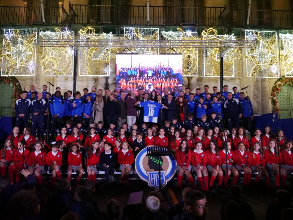 La iniciativa, que cumple su tercera edición, es la vez primera que tiene como escenario la Plaza del Ayuntamiento. En las dos primeras -2023 y 2024- se desarrolló en la avenida de la Constitución, junto al árbol gigante de Navidad. El coro, integrado por alumnas en su mayoría, y alumnos, al que se han sumado cerca de 200 jugadores de los equipos del fútbol-base, ha interpretado ‘Estime el Nadal’, ‘El burrito sabanero’, ‘Feliz Navidad’ y, finalmente, el ‘Himno del Hércules. Uno de los integrantes de la primera plantilla, Carlos Mangada, ha sido alumno de los Jesuitas, como el propio alcalde. El acto ha sido presentado por Carmen Gally.