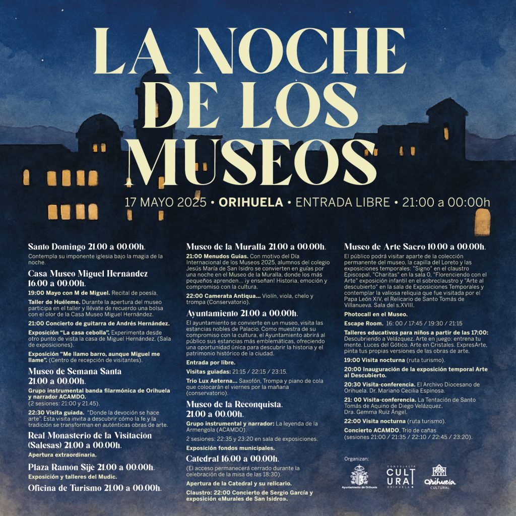 A partir de las 21:00 horas y hasta la medianoche, los principales espacios culturales de Orihuela abrirán sus puertas de manera gratuita y extraordinaria. Entre ellos, el Museo de Arte Sacro, el Museo de la Reconquista, el Ayuntamiento, la Oficina de Turismo, la Casa Museo Miguel Hernández o el Real Monasterio de la Visitación ofrecerán visitas libres y guiadas, además de actividades especiales como conciertos, talleres, escape room y rutas temáticas.