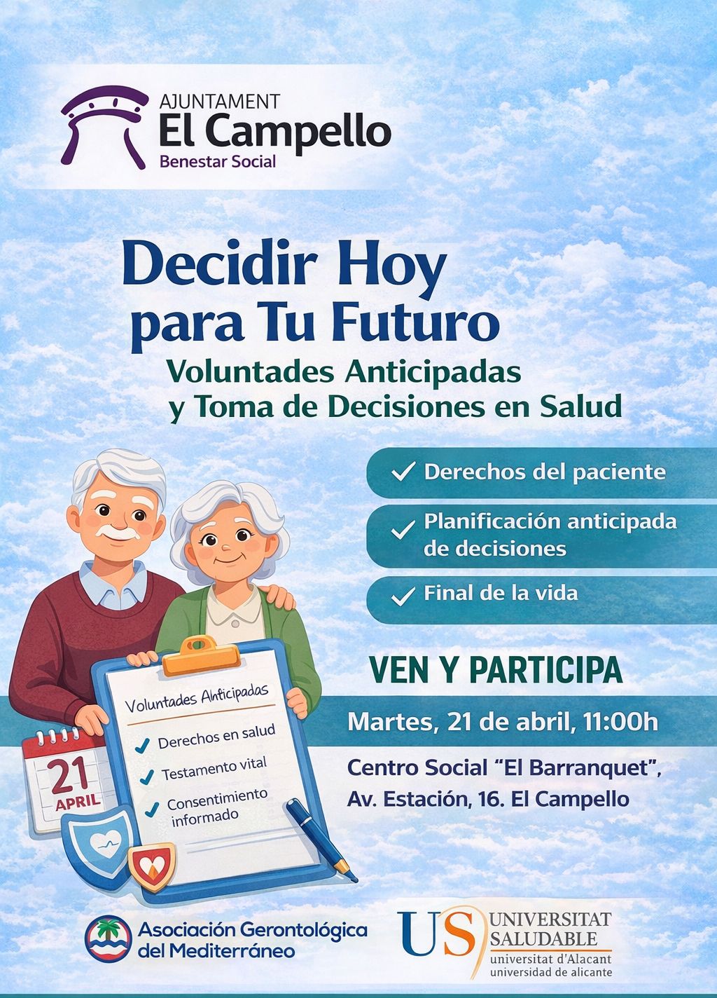 La Concejalía de Servicios Sociales del Ayuntamiento de El Campello, que dirige Maricarmen Alemañ, ha organizado el taller formativo “Decidir hoy para tu futuro: voluntades anticipadas y toma de decisiones en salud”, que se celebrará el próximo 21 de abril, de 11:00 a 12:30 horas, en el Centro Social El Barranquet.