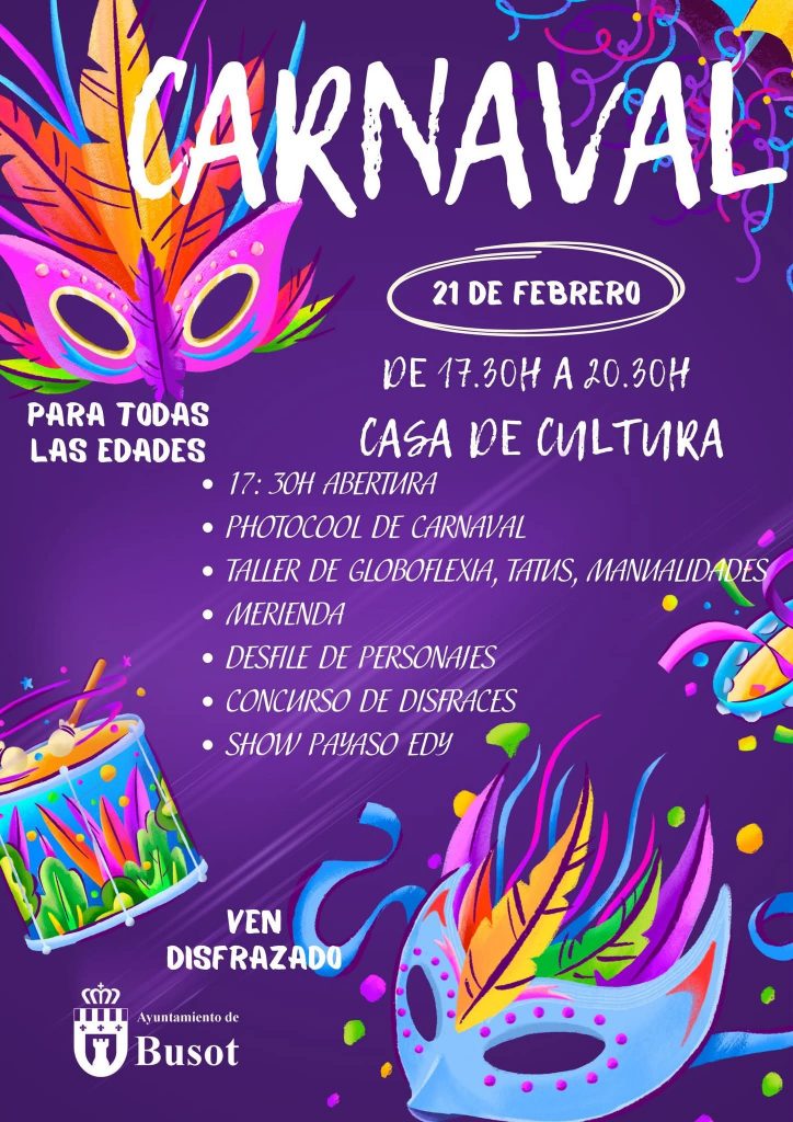El 21 de febrero, ven disfrazado a la Casa de Cultura a las 17.30h, para pasar una tarde muy divertida con talleres, merienda, desfile y concurso de disfraces.