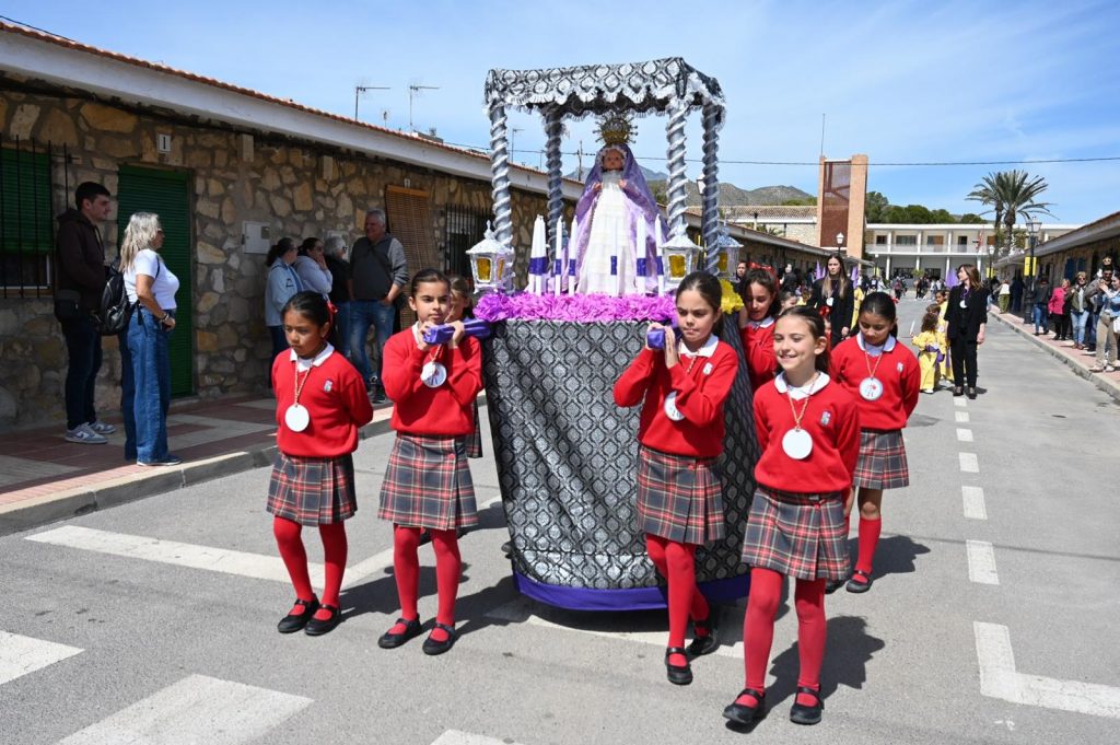 Niñas vestidas de damas de mantilla, capuchinos, música al son de flautas y tambores, dos pequeños pasos que los pequeños y pequeñas portaban a costal: la Virgen y la Cruz con el Santo Sudario, con los que escenificaron el Encuentro a las puertas mismas del colegio., momento en el que fueron las maestras y los maestros quienes se hicieron cargos de las andas para elevar las figuras y trasladarlas al interior de la Iglesia.