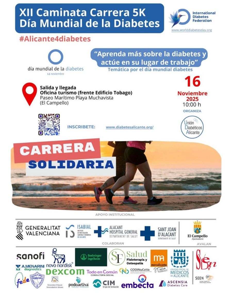 Por segundo año consecutivo, el paseo marítimo de Muchavista de El Campello acogerá, el próximo domingo 16 de noviembre a partir de las 10:00 horas, la caminata-carrera por el ”Día mundial de la diabetes”, que alcanza su XII edición. La recaudación íntegra de las inscripciones (10 euros hasta mañana, y 12 hasta meda hora antes del inicio de las pruebas) se destina a la Unión de Diabéticos de Alicante.