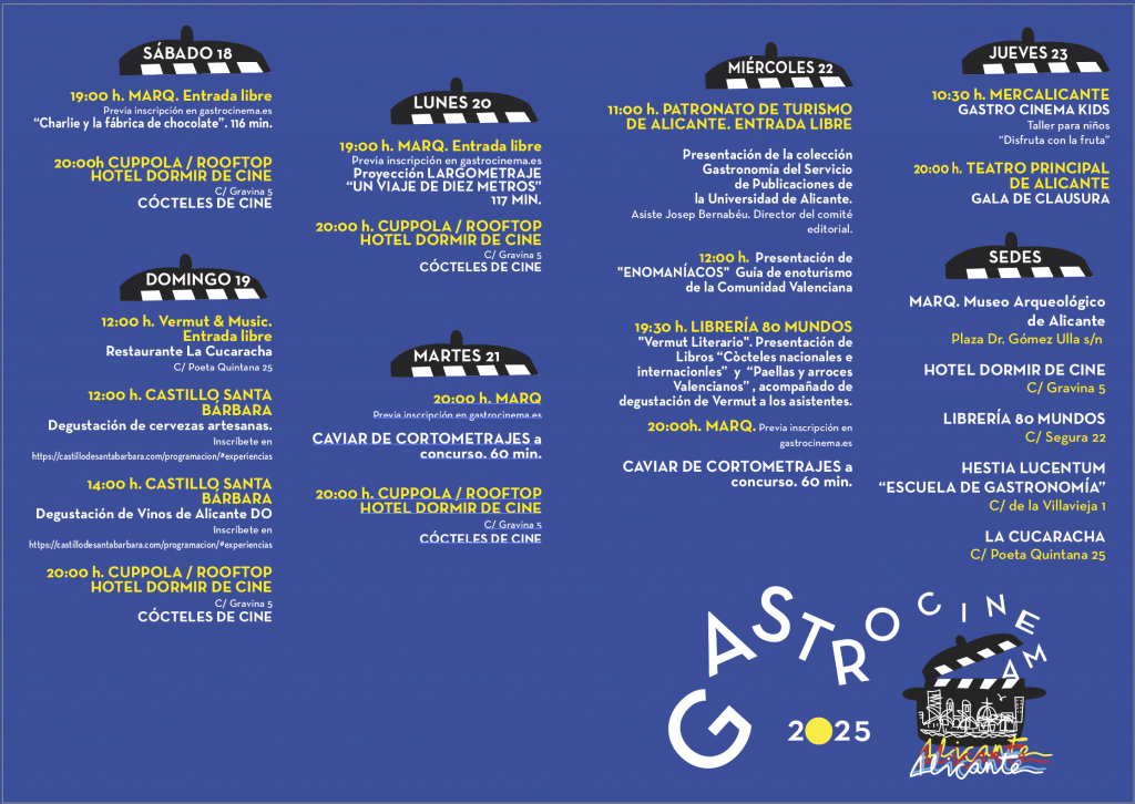 El certamen Gastro Cinema, que une cine y gastronomía en la ciudad de Alicante, ha completado la programación de su séptima edición, que se celebrará del 18 al 23 de octubre en distintas sedes de la ciudad. Una semana llena de sabor, cultura, cine, música y literatura, que vuelve a contar con el MARQ como sede principal.