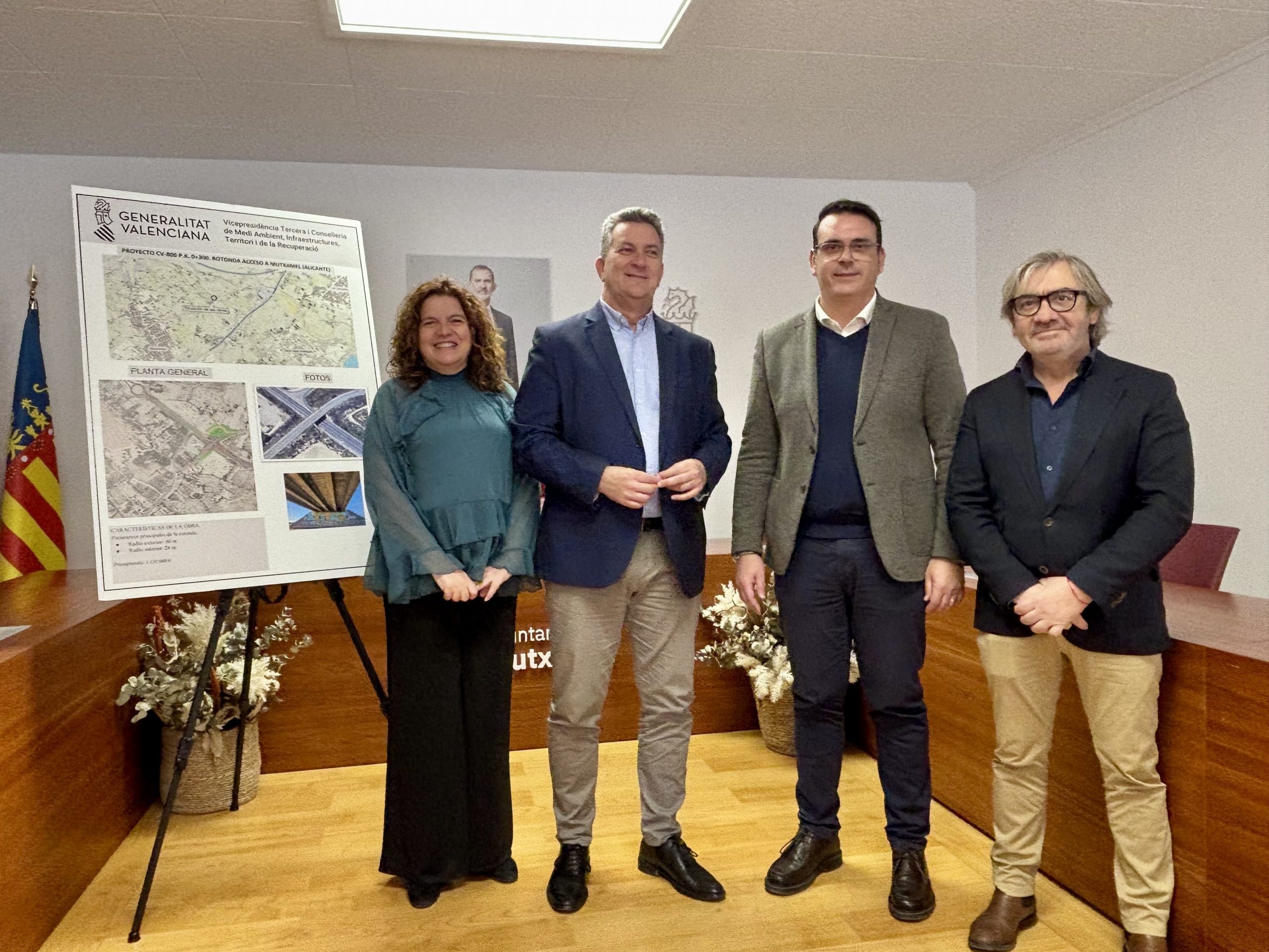 El vicepresidente tercero y conseller de Medio Ambiente, Infraestructuras, Territorio y de la Recuperación, Vicente Martínez Mus; el secretario autonómico de Infraestructuras, Javier Sendra, y la directora general de Infraestructuras Terrestres, María José Martínez Ruzafa, han presentado este jueves al alcalde de Mutxamel, Rafael García Berenguer, y al resto del equipo municipal, el proyecto de actuación que ha redactado el departamento y que contempla la demolición del paso superior existente y la construcción de la nueva rotonda.