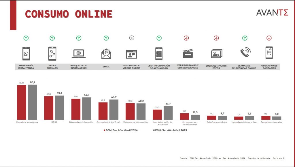 Alicante, 10 de diciembre de 2025. La vida digital de los alicantinos continúa expandiéndose. El análisis elaborado por AVANTE a partir de los datos de la 3ª ola del EGM 2025, revela un crecimiento sostenido en las principales actividades online. De esta forma se consolida un comportamiento cada vez más audiovisual, social y móvil en la provincia. El informe muestra cómo las plataformas de vídeo, las redes sociales y los servicios de música en streaming ganan protagonismo, mientras que la mensajería instantánea sigue siendo el gran eje de conexión entre las personas.