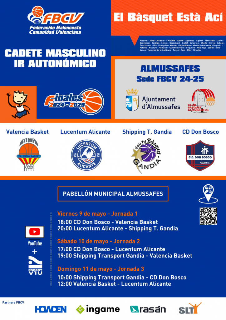 La Fase Final Cadete Masculino Autonómico se disputará en el Pabellón Municipal de Almussafes con la participación de Valencia Basket, Lucentum Alicante, Shipping Transport UPB Gandia y CD Don Bosco.