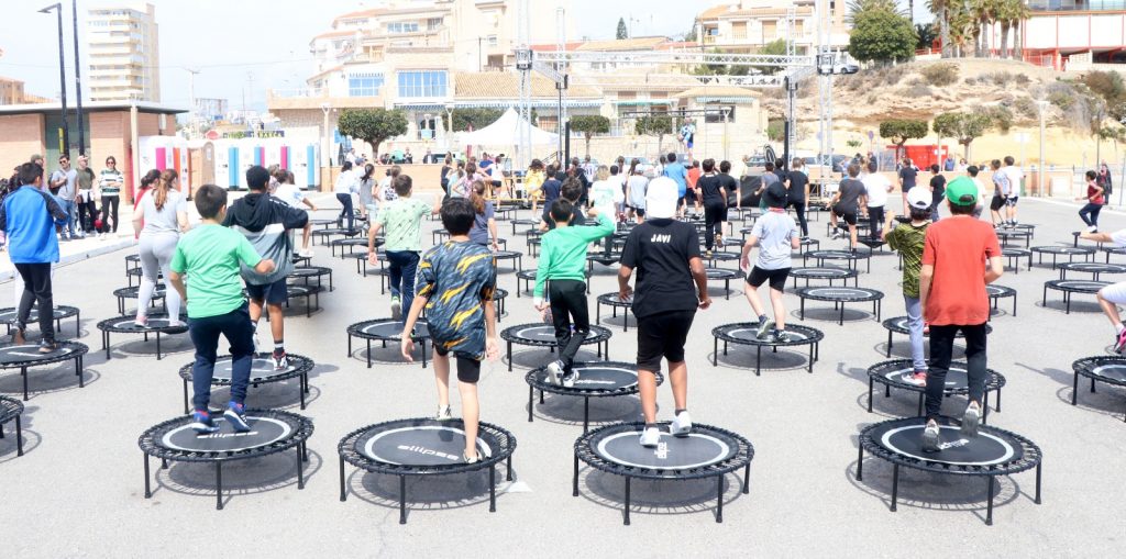 Alumnos de los cursos cuarto, quinto y sexto de los colegios Rafael Altamira, Fabraquer, Pla Barraques, Vincle y Bonny, han sido los primeros, esta mañana, en disfrutar del dispositivo montado ya para la celebración, durante todo el fin de semana, de una nueva edición de “El Campello Fitrness”, que supera los 600 inscritos, 60 monitores, 39 clases y 42 horas de deporte en tres escenarios diferentes: explanada del puerto, plaza Juan Pablo II y Paseo de Voramar, junto a la Torre de La Illeta.