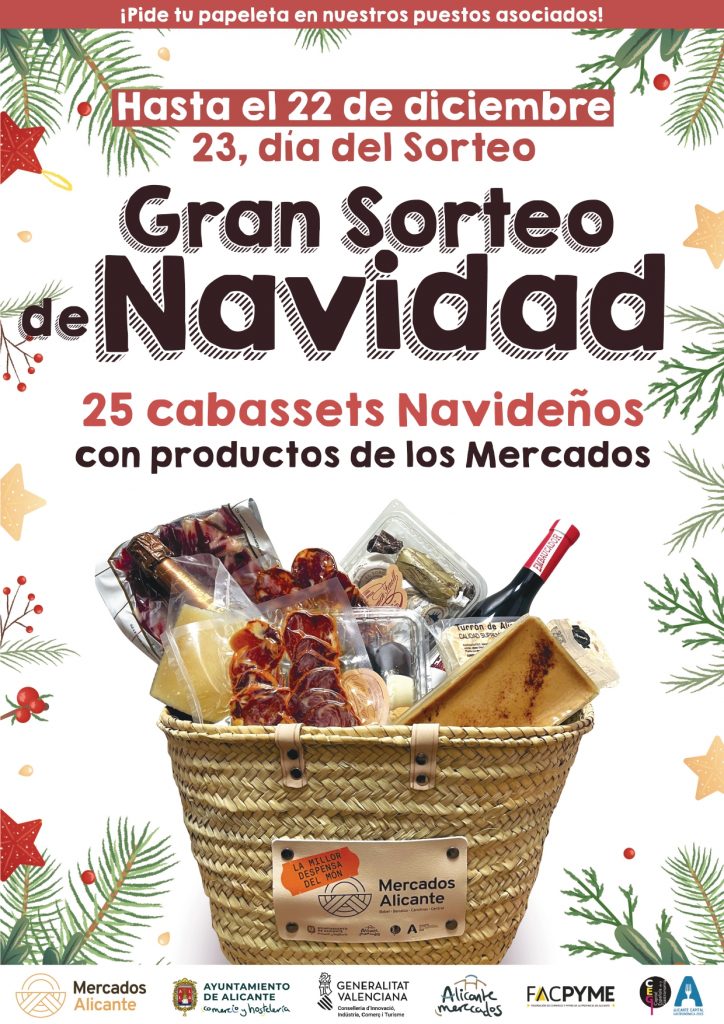 Alicante, 10 de diciembre de 2025. Los cuatro mercados municipales de Alicante se preparan para celebrar la Navidad más dulce con la puesta en marcha de su tradicional campaña del gran sorteo navideño creada para agradecer la confianza y fidelidad de sus clientes regalando 25 cabassets llenos de productos alicantinos de kilómetro cero por comprar en sus puestos concesionarios.