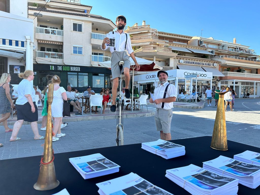 Pensado y hecho. Los trovadores de El Campello se desplazaron ayer al paseo marítimo de Carrer la Mar con ese objetivo, que consiguieron con mucha facilidad, además de sorprender a los paseantes y bañistas, que se acercaban al ver a tan pintorescos personajes, uno de ellos haciendo sonar una trompetilla y pregonando la programación con un antiguo megáfono, y el otro subido en una alta bicicleta de circo repartiendo folletos.