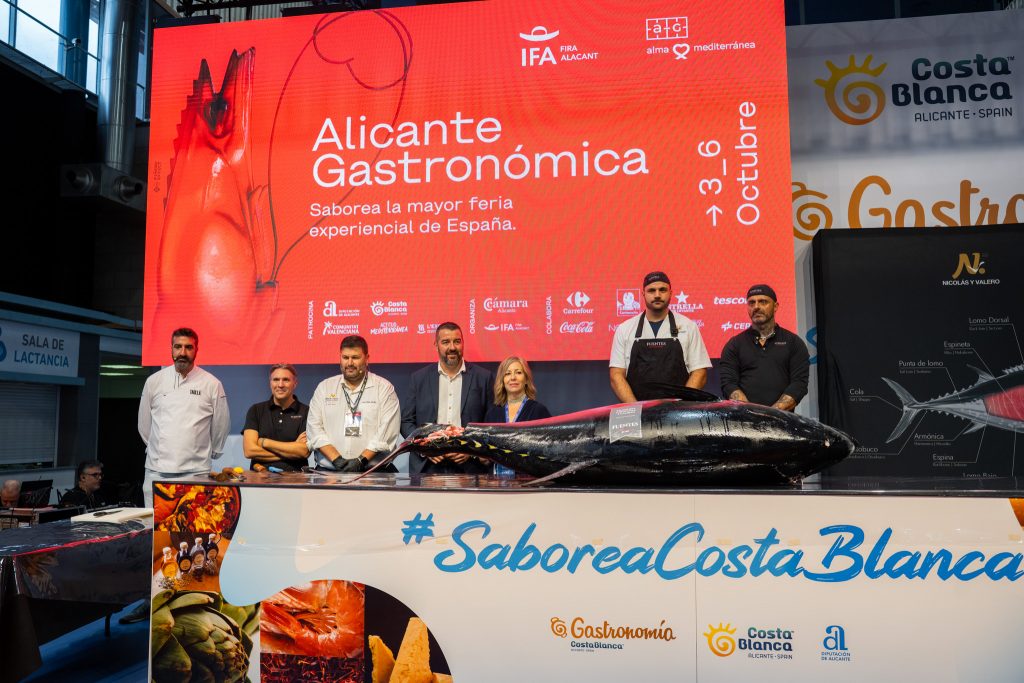 El espacio Saborea Costa Blanca ha acogido esta mañana uno de los espectáculos más impresionantes de la feria, el ronqueo del atún rojo, uno de los productos estrella que ofrece el Mediterráneo. Una pieza de 225 kilos que fue pescada ayer y han traído desde el vivero de San Pedro del Pinatar de la empresa Fuentes El Atún Rojo y ha sido despiezada con técnicas artesanales por parte de los profesionales de la compañía Nicolás y Valero.