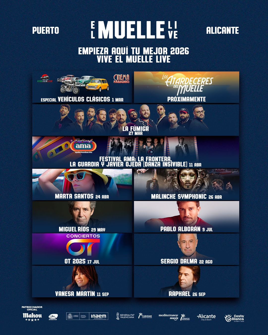 El Muelle Live Alicante, el nuevo espacio cultural y de ocio de referencia en la ciudad, ubicado en el emblemático Muelle de Levante del Puerto de Alicante, frente al mar y a pocos minutos del centro, acoge durante todo el año una completa programación de conciertos, mercados, arte, gastronomía y experiencias para todos los públicos, consolidándose como el epicentro cultural del litoral alicantino.