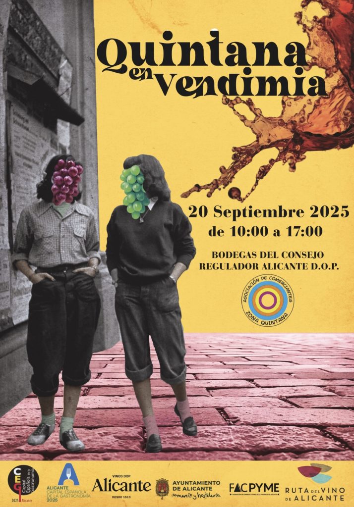 Alicante, 11 de septiembre de 2025. Alicante celebra la segunda edición de la jornada de dinamización comercial ‘Quintana en Vendimia’ que reunirá el sábado 20 de septiembre, en la calle Poeta Quintana, a 30 bodegas, el doble de las que participaron en la primera edición. La iniciativa ha sido organizada por la concejalía de Comercio y Hostelería del Ayuntamiento, la asociación de Comerciantes Zona Quintana, el Consejo Regulador de DOP, Facpyme y la Ruta del Vino de Alicante.