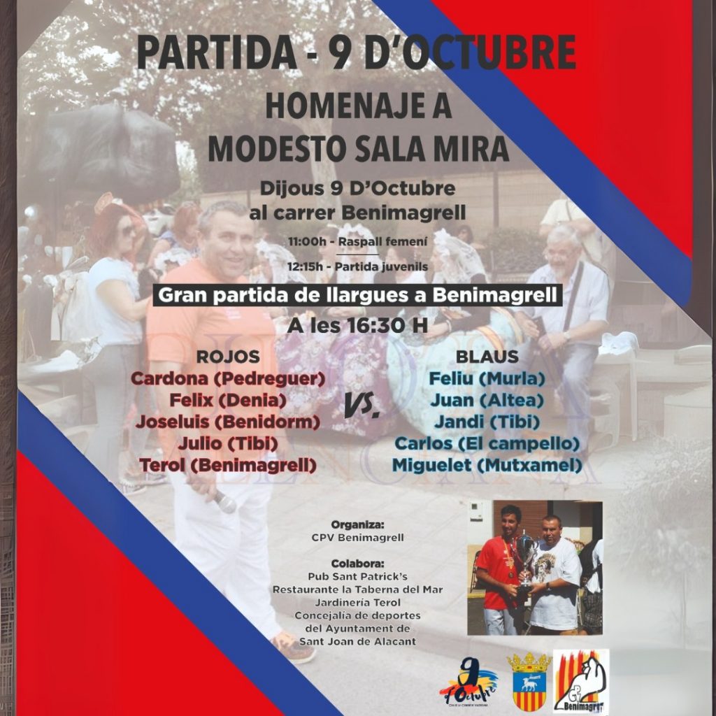 El deporte tradicional, la Pilota Valenciana, ofrece este año dos partidas de llargues de primer nivel, que se disputarán, en ambos casos en Benimagrell. El jueves 9, a las 16:30 horas será la partida de llargues Homenaje a Modesto Sala Mira, organizado por el Club de Pilota Valenciana de Benimagrell. Modesto Sala, vecino de Benimagrell, fallecido el pasado mes de mayo, ejerció durante muchos años las labores de ‘marxador’ en las partidas de pilota disputada en esta calle.