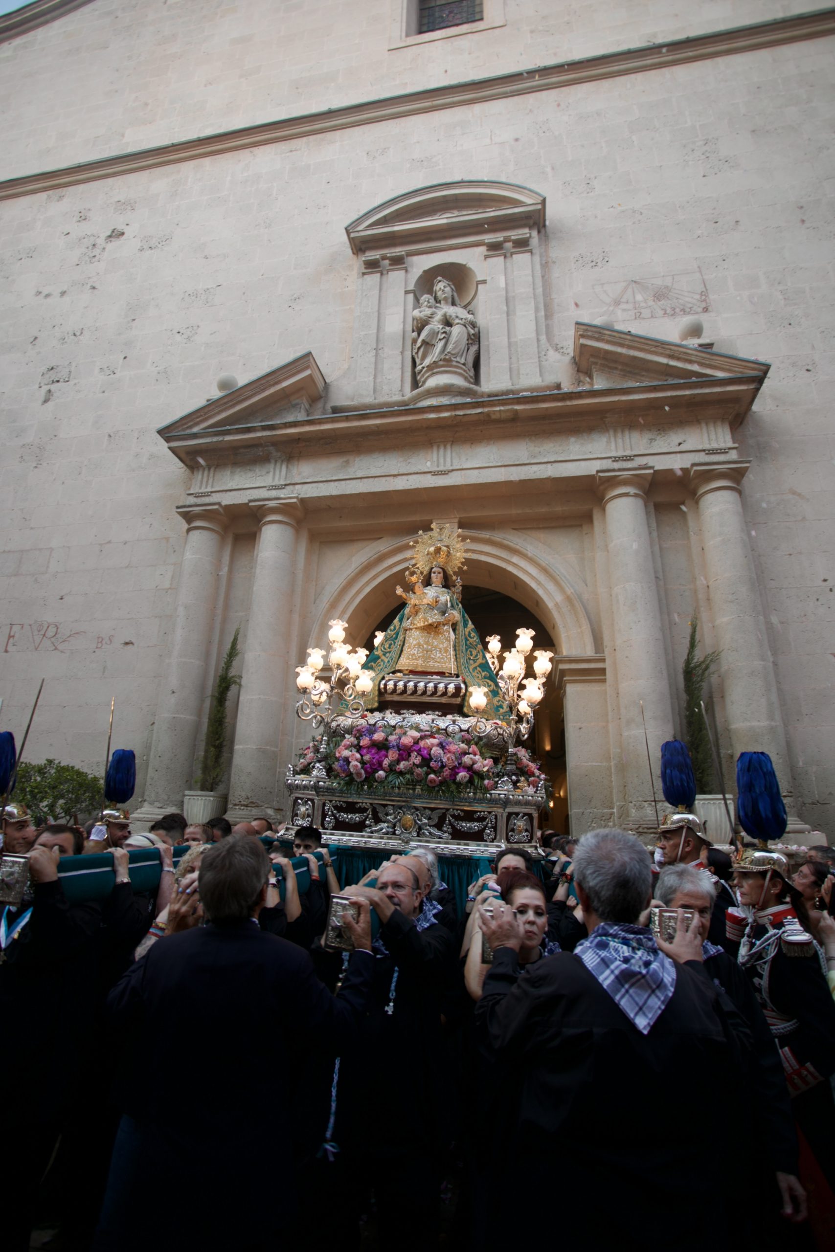 La decoración floral del trono de la Virgen ha estado basada en tonos rosados, malvas y verdes. La ha elaborado personal de la Real Archicofradía, coordinado por Mercedes Caballero. Sesenta costaleros con el típico blusón huertano han portado la imagen, de la que son capataces Ramón García, Laura Méndez y Francisco Cerezo.